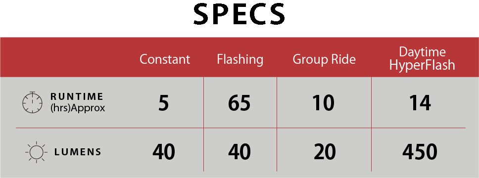 Czas świecenia: ciągły – 5 godz. (40 lumenów), migający – 65 godz. (40 lumenów), GroupRide – 10 godz (20 lumenów), HyperFlash – 14 godz. (450 lumenów).
