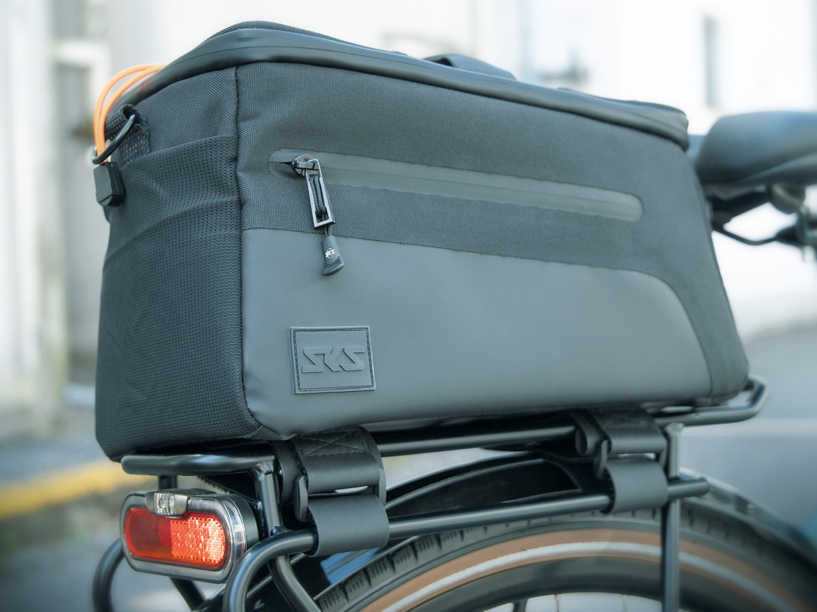 Kieszeń z tyłu, wewnętrzna przegroda i siateczkowa kieszeń w górnej części torby zapewniają porządek i szybki dostęp. Górną część można całkowicie otworzyć za pomocą zamka błyskawicznego Easyzip. Praktyczna funkcja: podwójna siateczkowa kieszeń pomieści dodatkowy bagaż. Z przodu i z tyłu torby przymocowane są odblaskowe elementy, zapewniające widoczność w ruchu drogowym. Wytrzymały uchwyt i pasek na ramię ułatwiają transport torby, nawet gdy nie używasz roweru. Praktyczny pokrowiec przeciwdeszczowy dopełnia bogate wyposażenie. Uwaga: płytki adaptera i śruby nie są dołączone.
