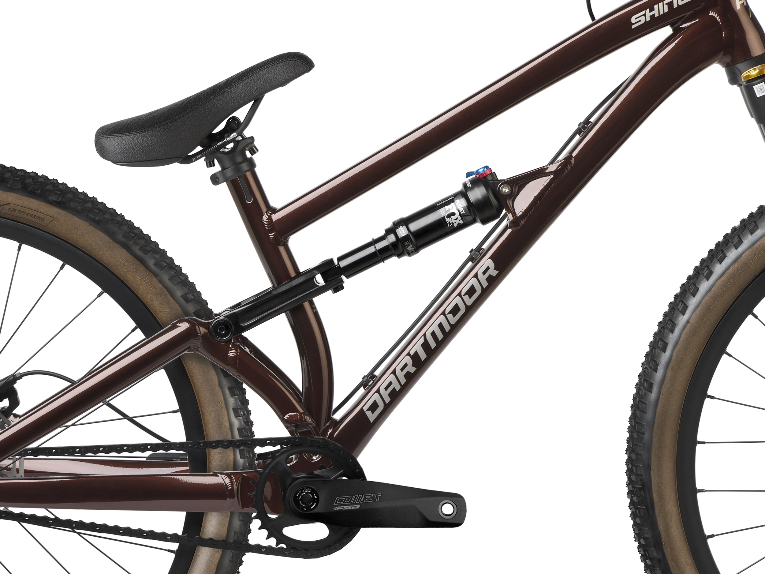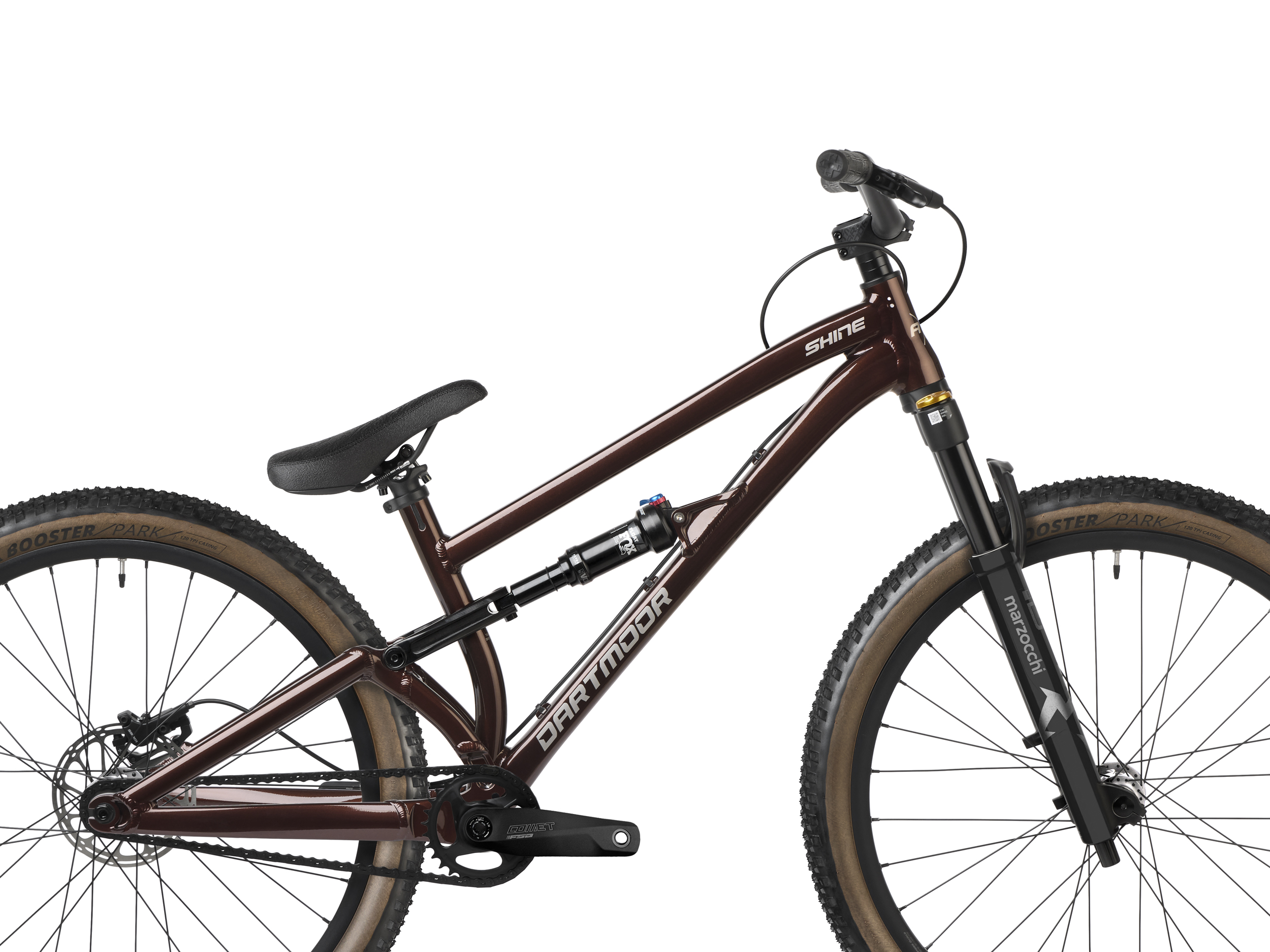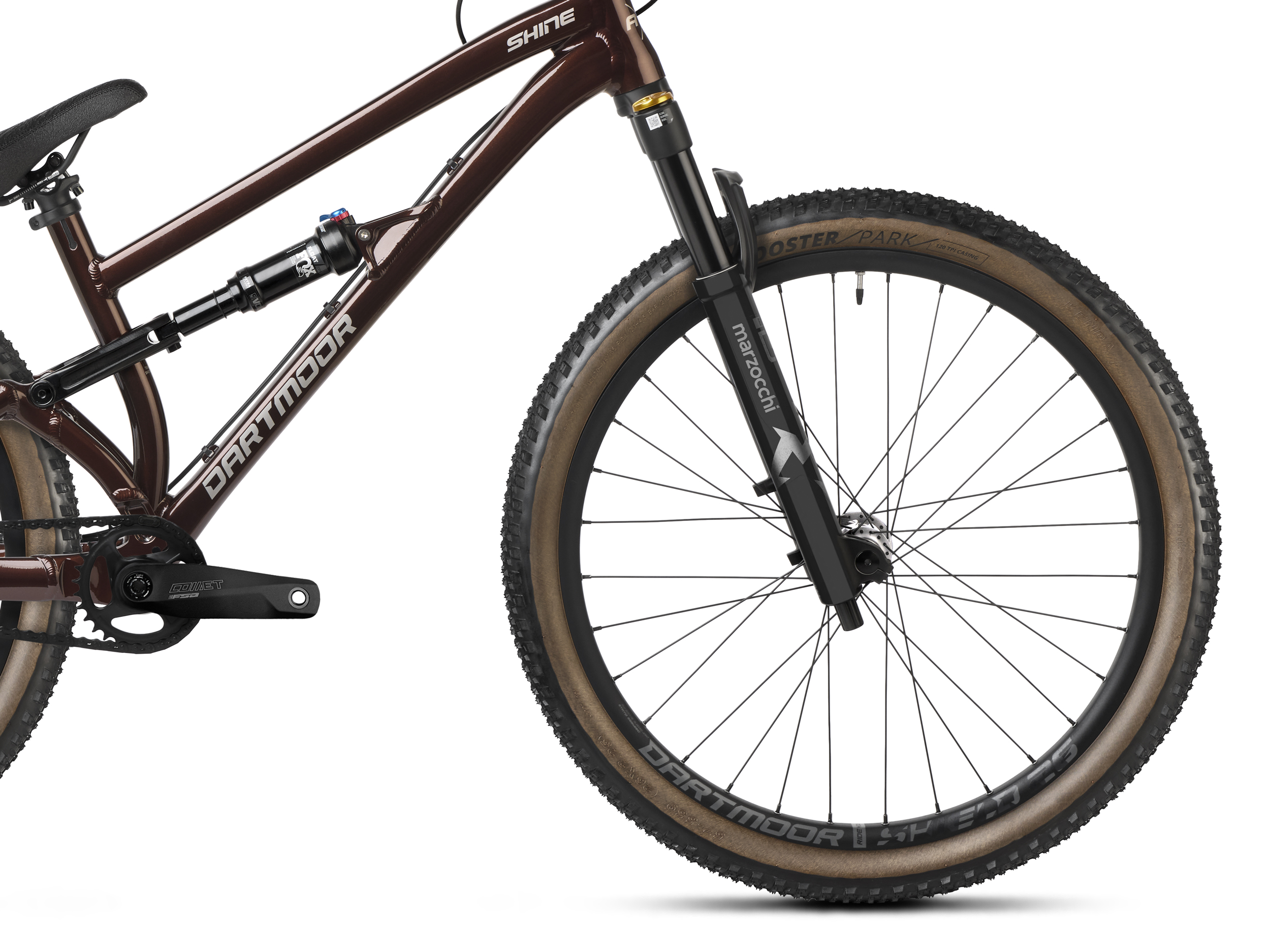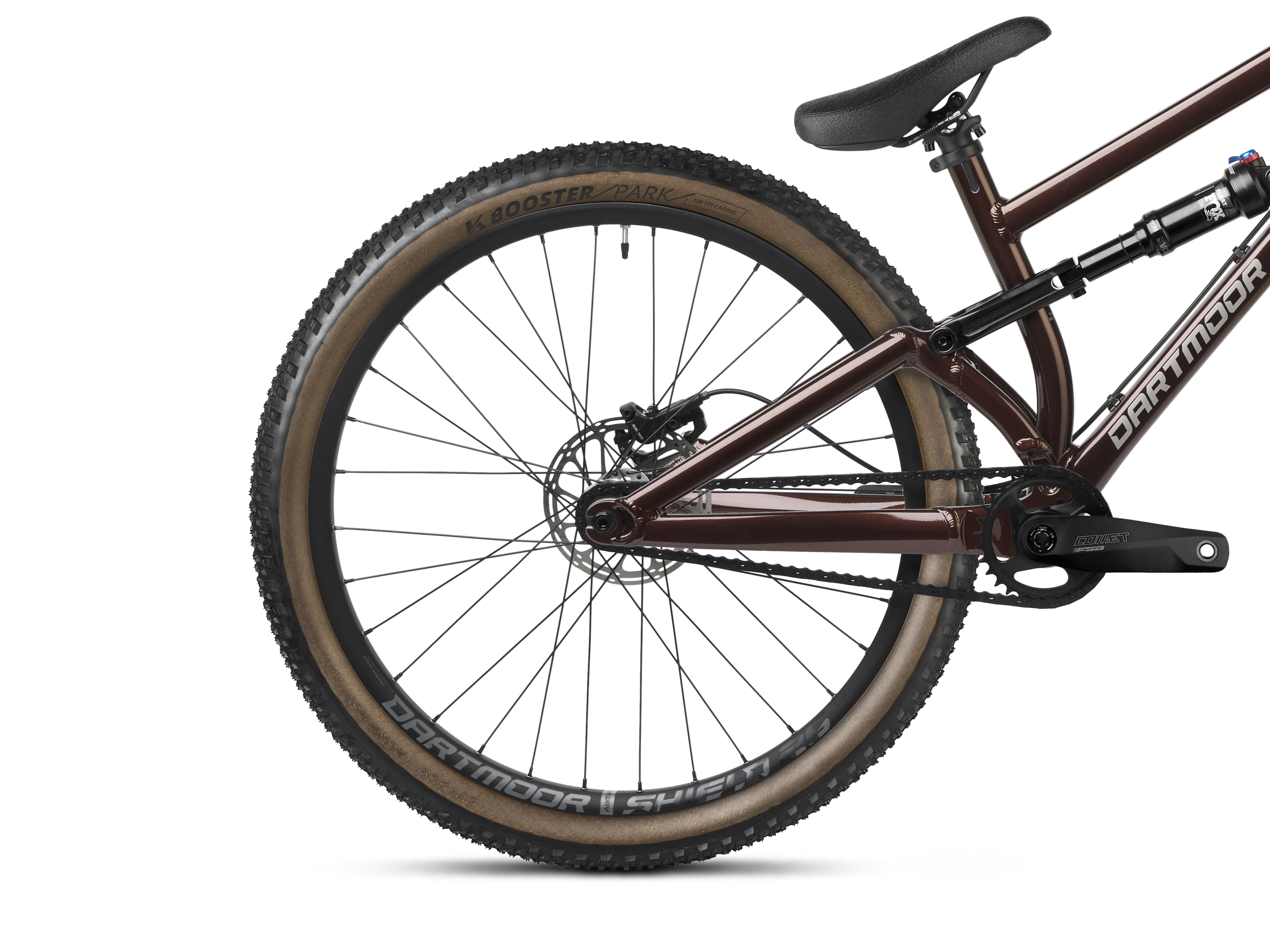 Koła zbudowane na obręczach Dartmoor Shield i oponach Kenda Booster Park 120 TPI z brązowymi bokami to idealny balans przyczepności, prędkości i stylu.