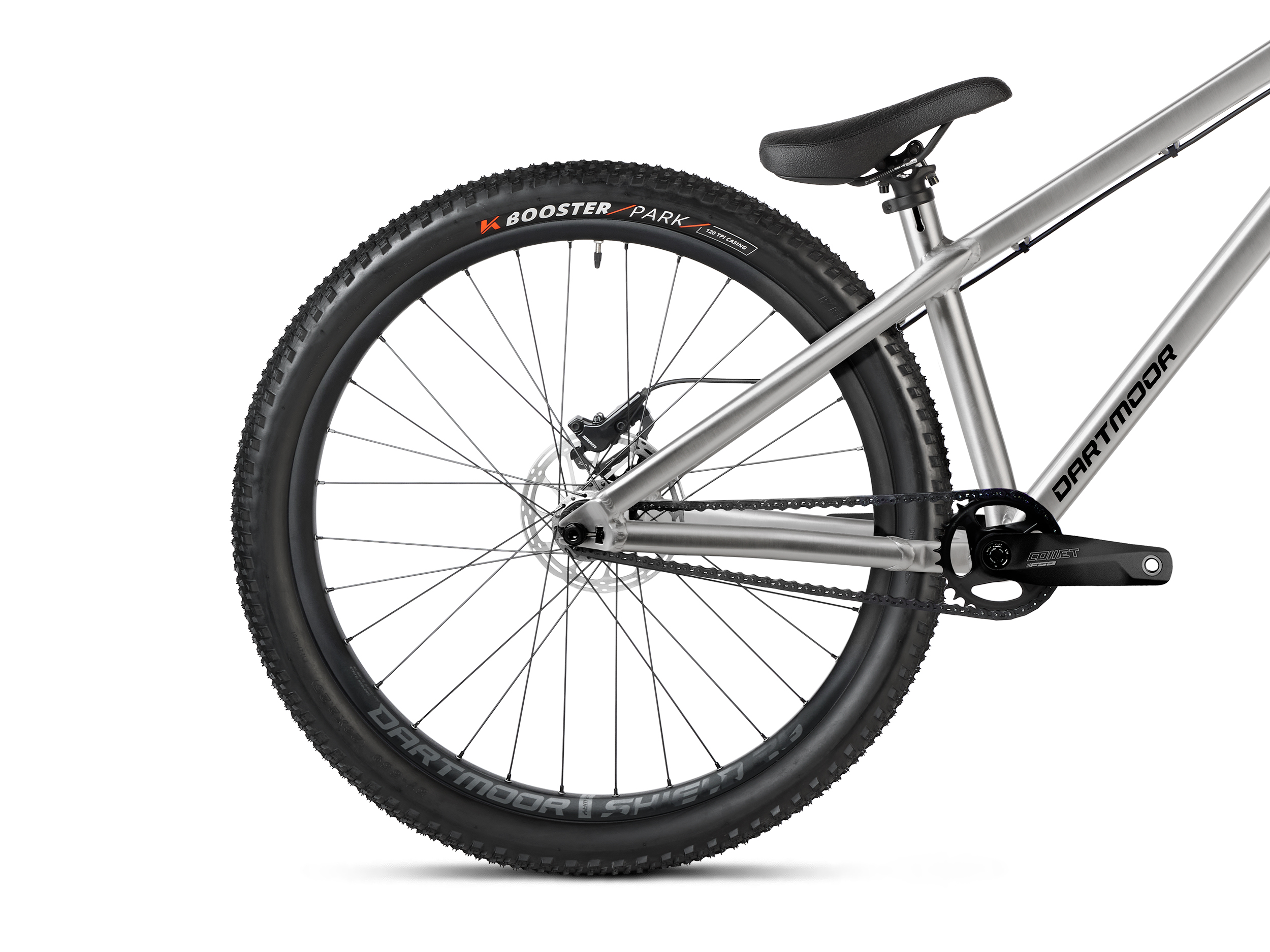 Koła zbudowane na obręczach Dartmoor Shield i piaście Reel Pro Singlespeed 10T, z oponami Kenda Booster Park 120 TPI, gwarantują lekkość, szybkość i przyczepność na dircie i w skateparku.