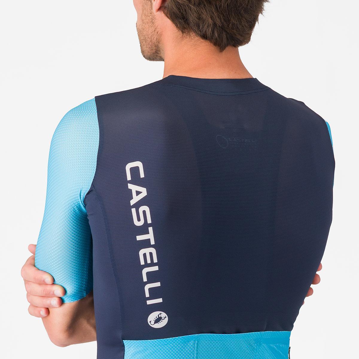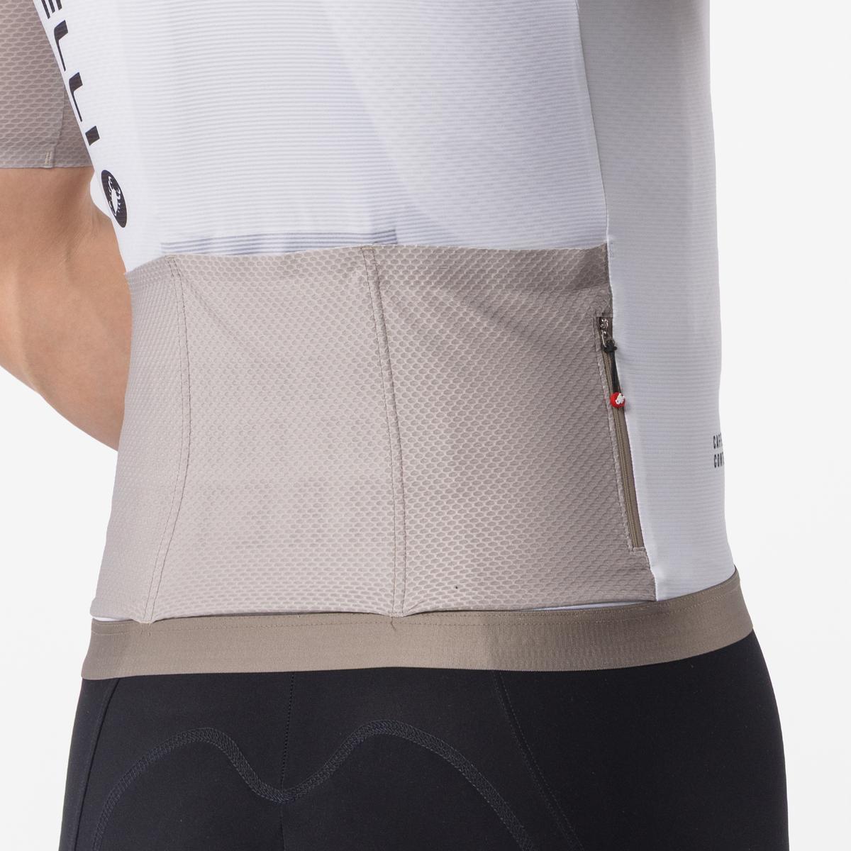 Tkanina Nano Flex firmy Castelli odpycha wodę dzięki połączeniu wykończenia DWR i milionom ultra-drobnych nanowłókien, które powodują, że krople wody zbierają się na powierzchni i spływają zamiast wsiąkać. Wykończenie Nano Flex utrzymuje się przez około 40-50 prań — pod warunkiem właściwej pielęgnacji. Jeżeli detergent zawiera zmiękczacz tkanin, wykończenie może zostać natychmiast zniszczone.