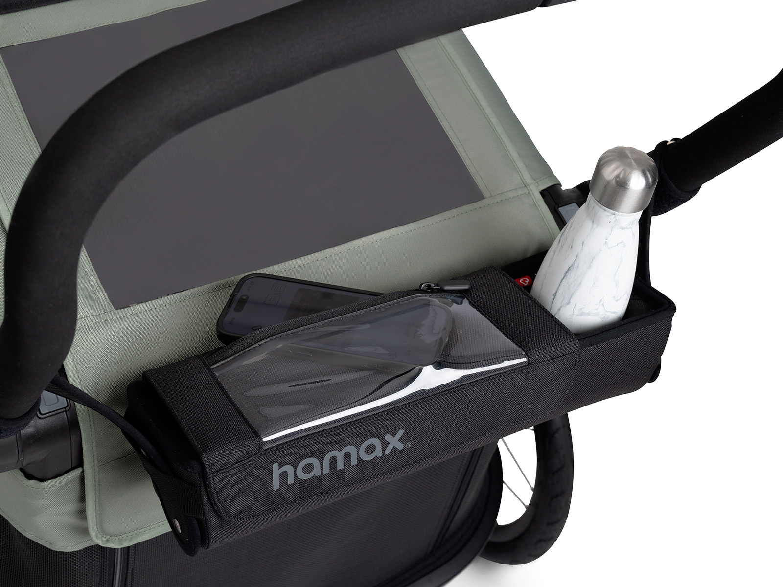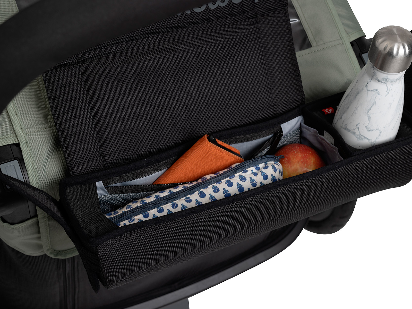 Organizer można łatwo przymocować do rączki przyczepki, zapewniając wygodne i sprytne miejsce do przechowywania podczas użytkowania przyczepki. Wszystkie rzeczy znajdują się pod ręką dzięki dużej przestrzeni głównej, uchwytowi na butelkę oraz kieszeni na telefon.
