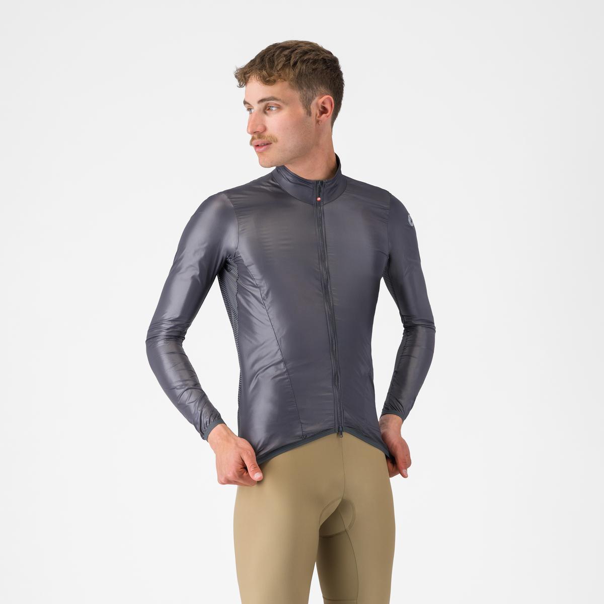 Przeciwwiatrowa kurtka kolarska. Wewnętrzna strona rękawów wykonana z elastycznej siateczki, dzięki czemu kurtka idealnie dopasowuje się do użytkownika. Zajmuje bardzo mało miejsca po złożeniu – bez problemu mieści się w kieszonce koszulki. Elementy odblaskowe dla poprawy bezpieczeństwa. Tylna kieszeń. Zamek YKK Vislon. Przód wykonany z mikrofibry. Waga 109g (L). Sugerowany przez Castelli zakres temperatur: 10-18 st. C